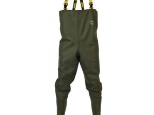 Wytrzymałe wodery z PVC. Nieprzemakalny materiał, łączenia bezszwowe. Grube PVC (800 g/m2). Waga rozmiaru 42/43: 2 350 kg Podeszwy ze żłobieniami. Elastyczne, regulowane paski boczne.