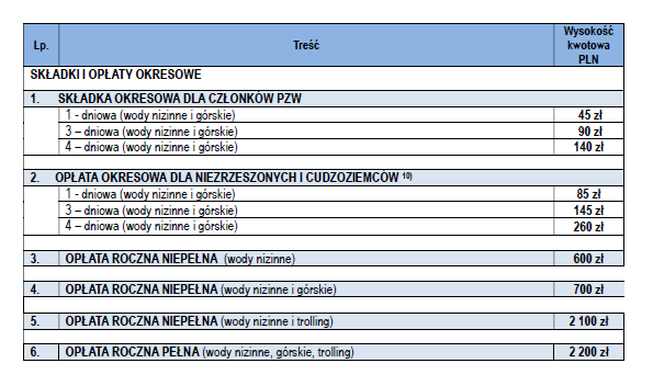 - Składki okresowe dla członków zrzeszonych PZW oraz opłaty dla osób niezrzeszonych i cudzoziemców